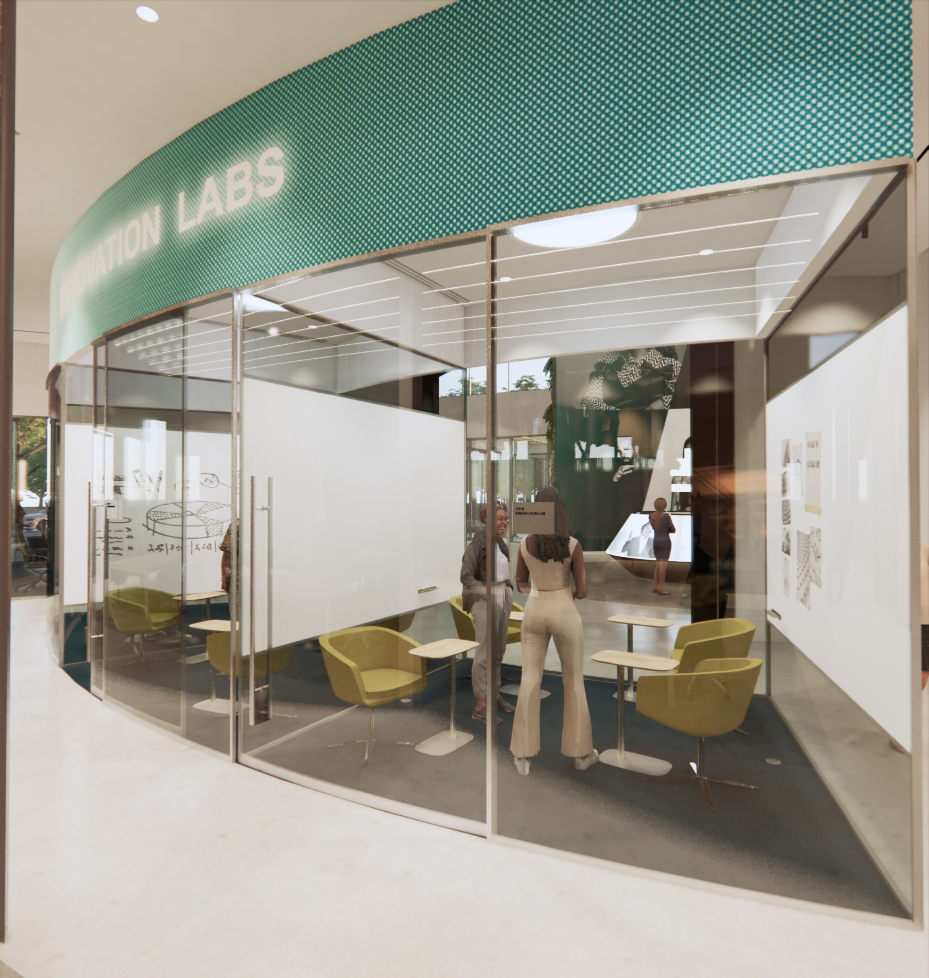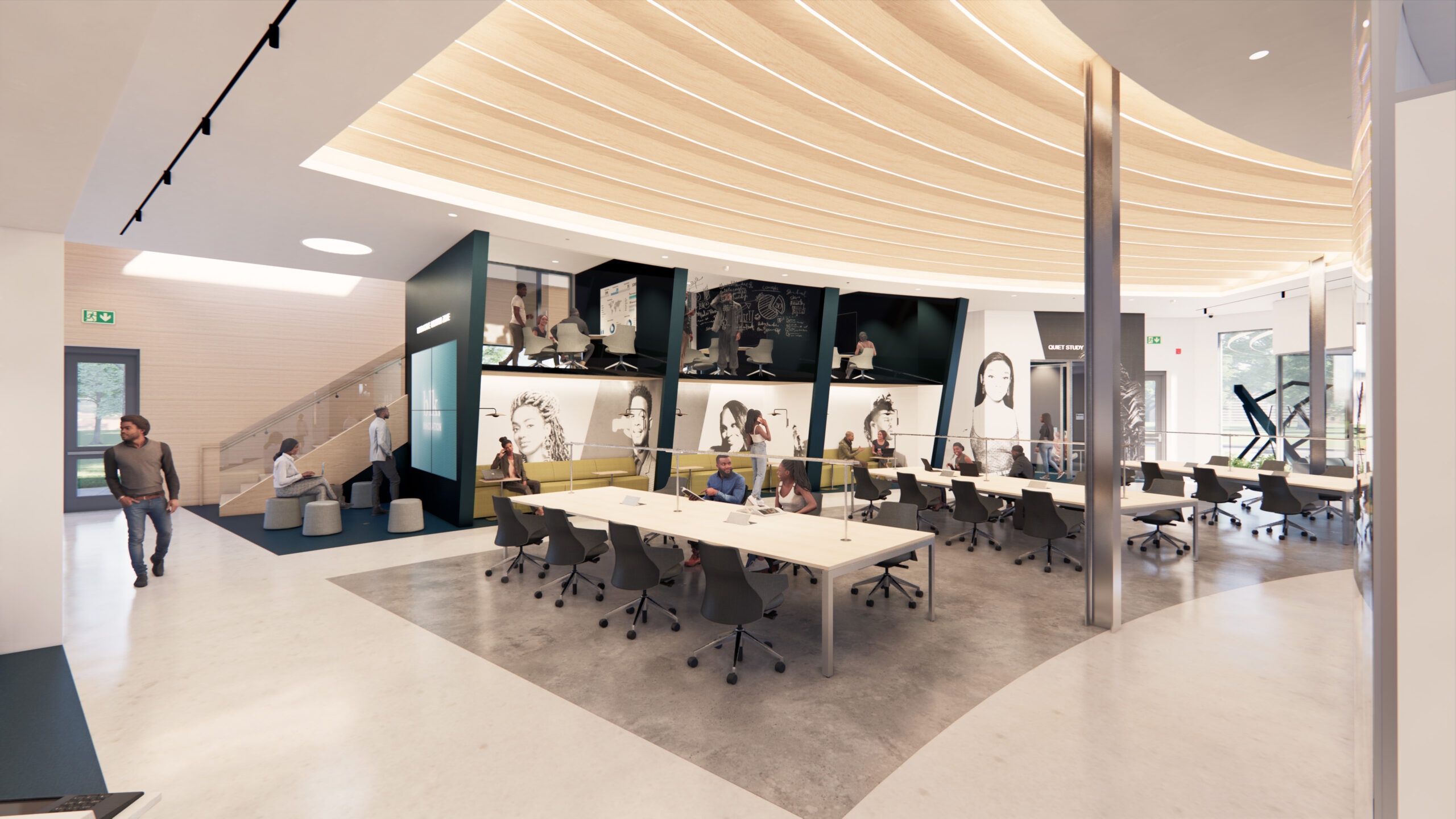 Central to the design is a display showcasing Black achievements intricately integrated into the space’s essence. This radial layout connects social, academic, and support areas, guiding users through a narrative reflective of their unique experiences. The central display acts as the hub’s core, influencing every aspect and establishing a profound connection between architecture and storytelling. Soft curves emanating from this focal point envelop users in a sanctuary where they feel recognized, valued, and encouraged to interact spontaneously, nurturing a sense of community and belonging. The design prioritizes openness, transparency, technology, and user needs, seamlessly integrating natural elements to promote well-being and deepen users’ attachment to the environment.